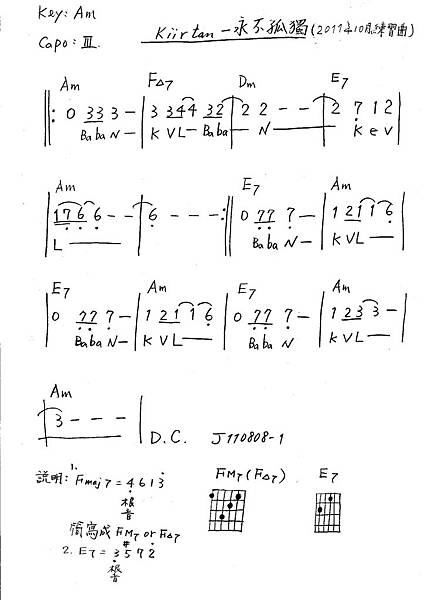 譜好了.永不孤獨該曲是爵士風.所以和絃採用了第七音.如FM7 or E7